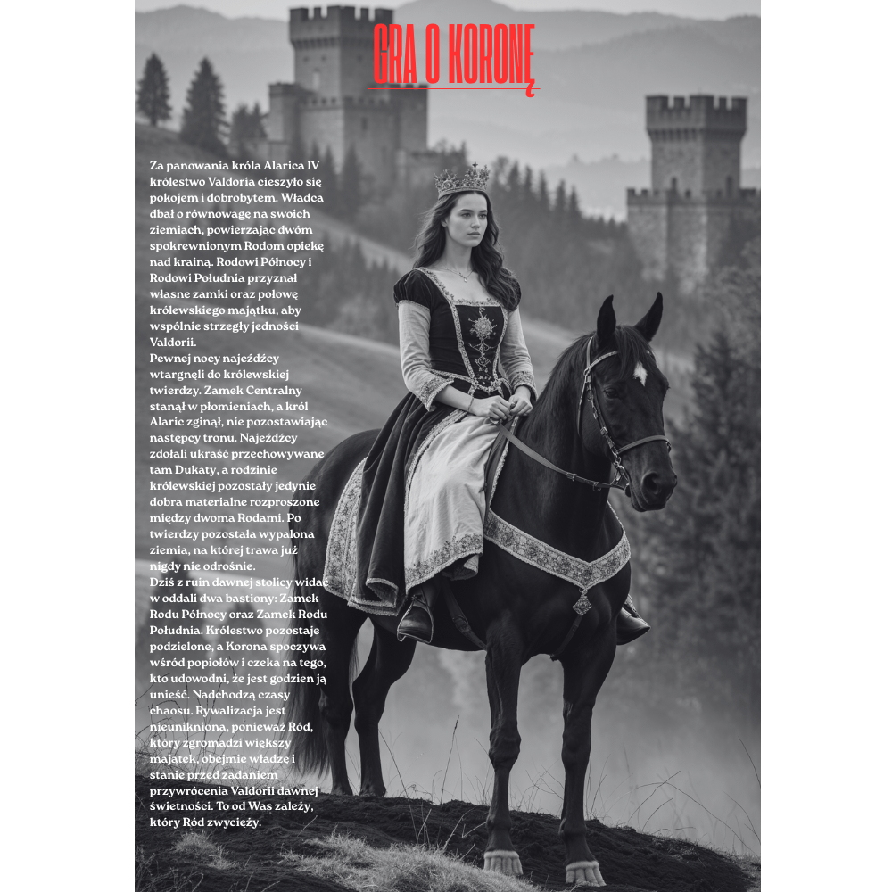 Królestwo zostało spalone. Centralny zamek legł w ruinach po nagłym ataku najeźdźców, a wraz z nim przepadły królewskie dukaty i cały zgromadzony majątek. Król zginął, nie wyznaczając następcy. Pozostały tylko dwa rody — Ród Północy i Ród Południa — samotne filary dawnego królestwa.